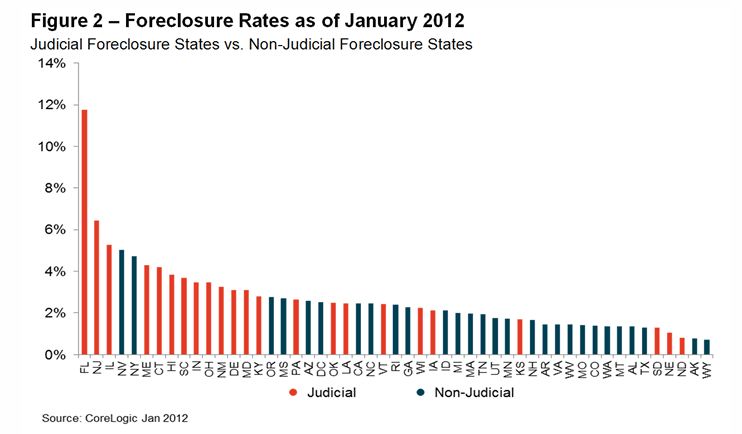 “The pace of completed foreclosures is gradually increasing again, but the clearing ratio is falling as REO sales have slowed in the winter months. Judicial foreclosure states1 are continuing to process foreclosures more slowly than non-judicial foreclosure states,” said Dr. Mark Fleming, chief economist with CoreLogic. “Non-judicial foreclosure states completed almost twice as many foreclosures per 1000 active loans as judicial foreclosure states in January.”