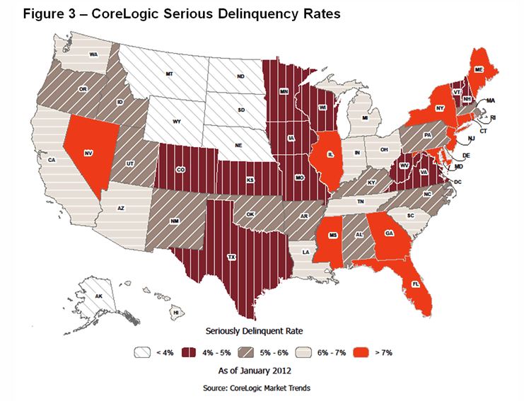 The five states with the largest number of completed foreclosures for the twelve months ending in January 2012 were California (155,000), Florida (86,000), Arizona (65,000), Michigan (65,000), and Texas (57,000). CoreLogic reports that these five states account for 49.7 percent of all completed foreclosures nationally.