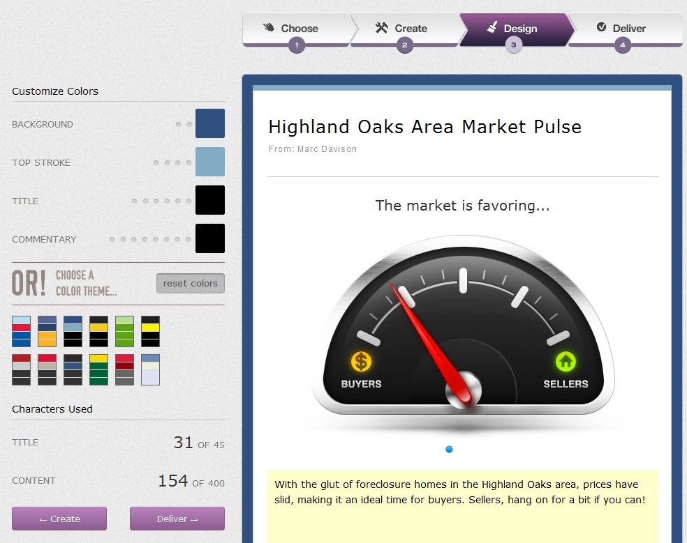 There is no ugly clip art, no outdated typography, no lengthy paragraphs, no endless lists of links or cluttery graphs, and the app very specifically answers to the pain points of Realtors and consumers so that an agent can spend a minute creating a laser focused report, and a consumer can spend a second looking at the email and getting an instant pulse on their market.