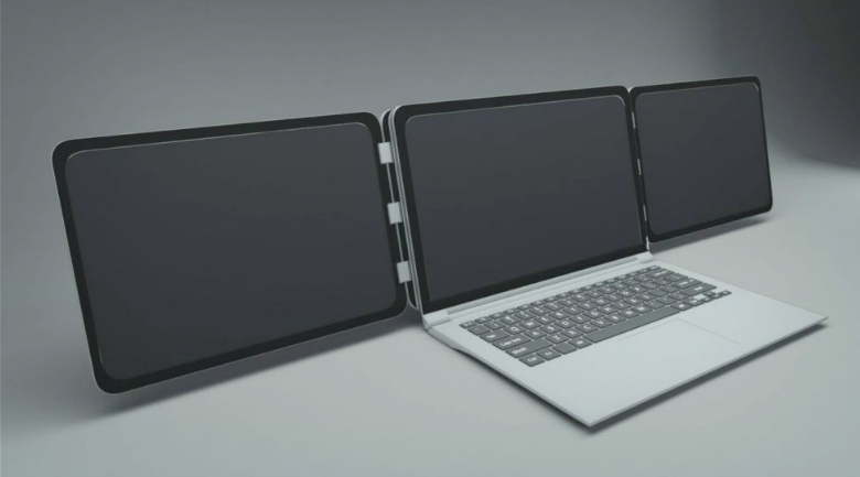 Once you snap your Sliden’Joy onto the back of your laptop, simply slide your extra screens out from the hidden pocket inside the slab and you immediately double or triple your laptop screen size. Once you’re done with the extra screens, or need to store your computer, slide the Sliden’Joy screens back into the slab and your laptop will fit into your normal laptop bag.