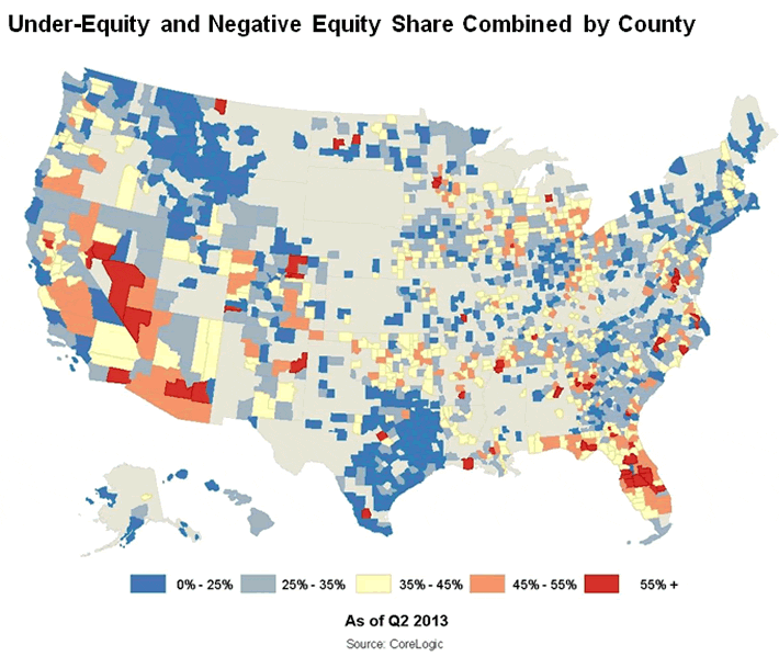 Under-equitied mortgages accounted for 21.1 percent of all residential properties with a mortgage nationwide in the second quarter of 2013. At the end of the second quarter of 2013, 1.7 million residential properties had less than 5 percent equity, referred to as near-negative equity.
