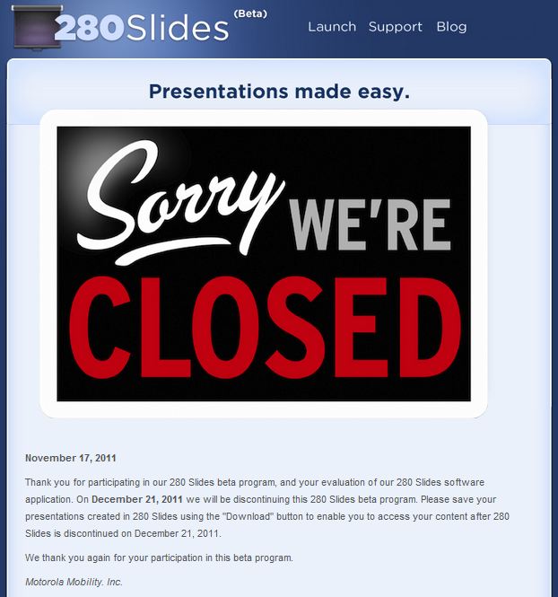 “Thank you for participating in our 280 Slides beta program, and your evaluation of our 280 Slides software application. On December 21, 2011 we will be discontinuing this 280 Slides beta program. Please save your presentations created in 280 Slides using the “Download” button to enable you to access your content after 280 Slides is discontinued on December 21, 2011.