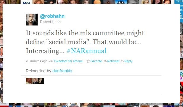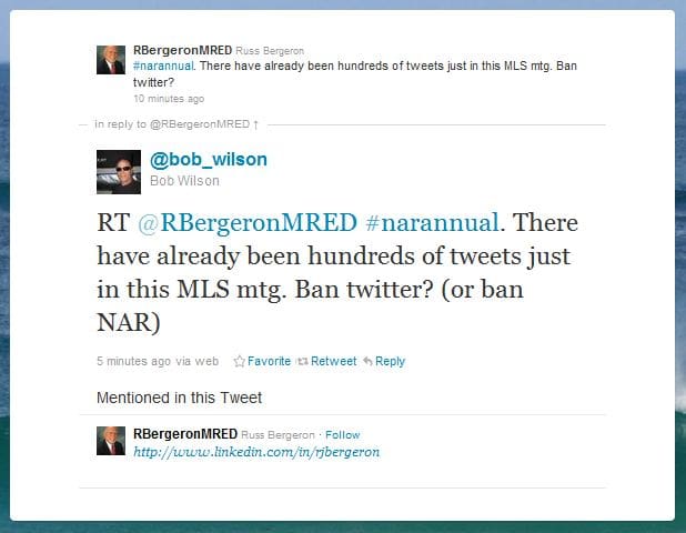 We noticed a classic story being told through Twitter about the struggle of some to reject social media and how it is being used versus those who are pushing the very tools of social media in Realtors’ faces. At the National Association of Realtors (NAR) annual conference, the following tweets took place: