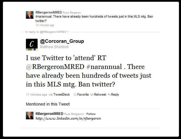 The idea of banning Twitter was likely meant to apply to the MLS Committee meeting, but the meeting was not only an open meeting (closed meetings are held at NAR), but contained a ruling on a topic that thousands of people have been waiting on for months, and the meeting has been built up for so long that of course people are going to talk about it live. The only way Twitter could be banned is if the venue jams cell phone reception, disallowing texts, phone, and internet use which we don’t imagine 18,000 Realtors would be very receptive to (can you imagine taking a Realtor’s phone away for an entire day?).