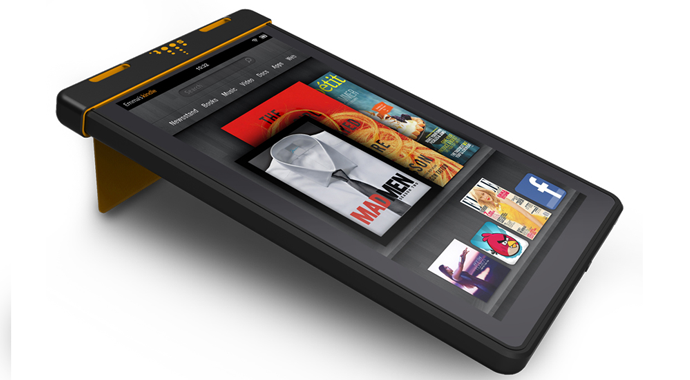 A “chamber” pops on to the end of the Fire, is non-electric, and simply props the device up with a removable stand that is the size of a credit card which is inserted into a slot, thus creating a kickstand. The design allows for landscape view for watching a movie, portrait for reading news or blogs, and a low, tilted angle for typing.