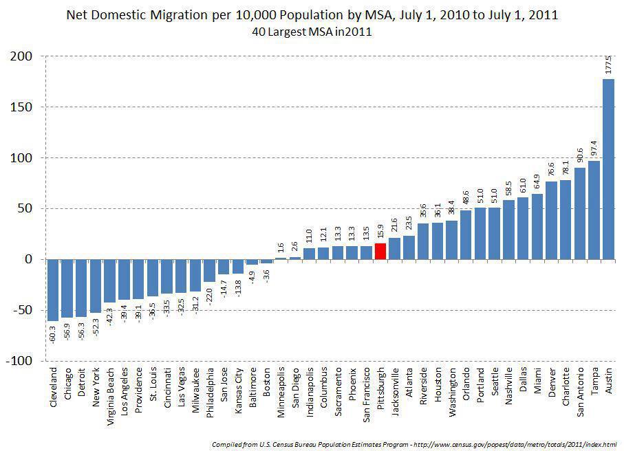 The graph below shows net migration per 10,000 population by Metropolitan Statistical Area from July, 2010 to July, 2011 for the 40 largest MSAs in 2011: