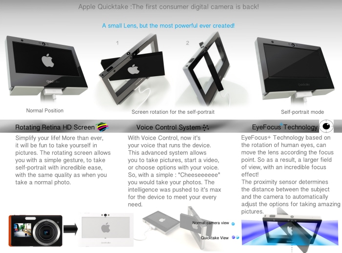 Dumary added, “This is the first camera in the world with a lens that can rotate a few millimeters to the right or left to better focus in manual focus or auto focus with technology Eyefocus +. A camera like a smartphone, easy to use whether you are amateur or professional. The wide screen retina, HD, displays images ever seen on a camera screen, navigate through the options with ease, can be rotated to make a self portrait. System with voice control, you can take a picture, saying Cheeseeee! you can now talk to your camera and it will recognize your voice!” According to Yanko Design, below are the full specs for the Apple Quicktake concept.