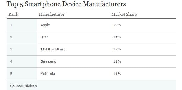 In 2011, Nielsen says that nearly one in three phones were manufactured by Apple yet nearly half of all smartphones use the Android operating system. The pendulum is swinging for these companies as they seek each other’s market share.