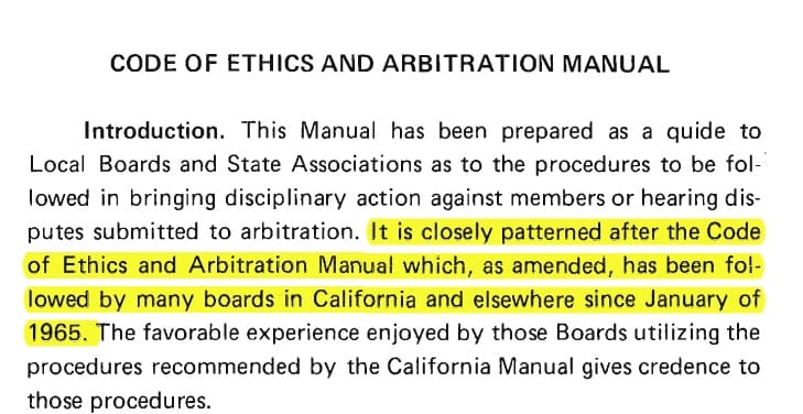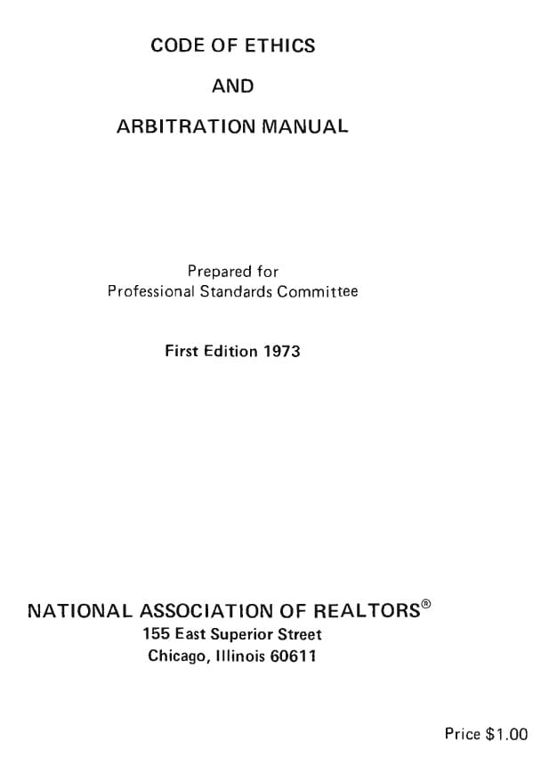 To find the first arbitration guidelines created by NAR and distributed as a set of suggested rules for boards to follow, we have to travel all the way back in time to 1929. NAR’s first Code of Ethics & Arbitration Manual wasn’t created until 1973, and it credited a 1965 California Association of Realtors version as its model.