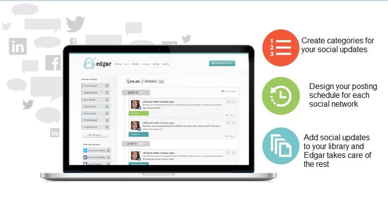 Getting started with Edgar is a three-step process which you can customize further, later. First, connect your social media: Facebook, Twitter, and LinkedIn, then write a social media update and upload it to Edgar. Edgar will then categorize it for your library. Second, Edgar will post your update according to your category-based schedule.