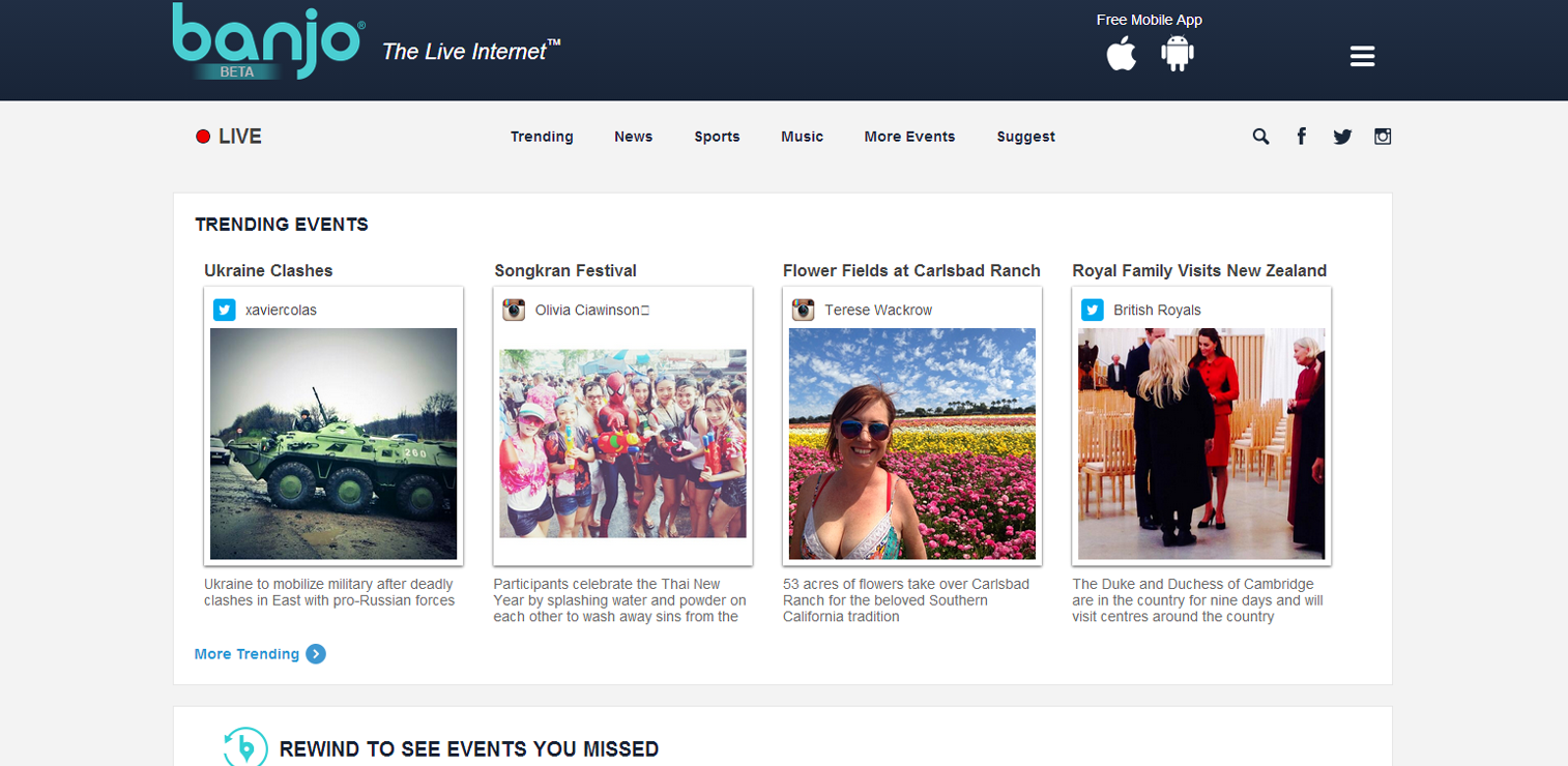 Banjo began as social media aggregator; allowing you to see the social media updates of people around you. When it first launches, it introduced “Rewind.” A creative way to look back at specific events, any time you want. Now, it is a multi-faceted product that allows both consumers and media companies to share real-time events and news as they happen across social media channels.