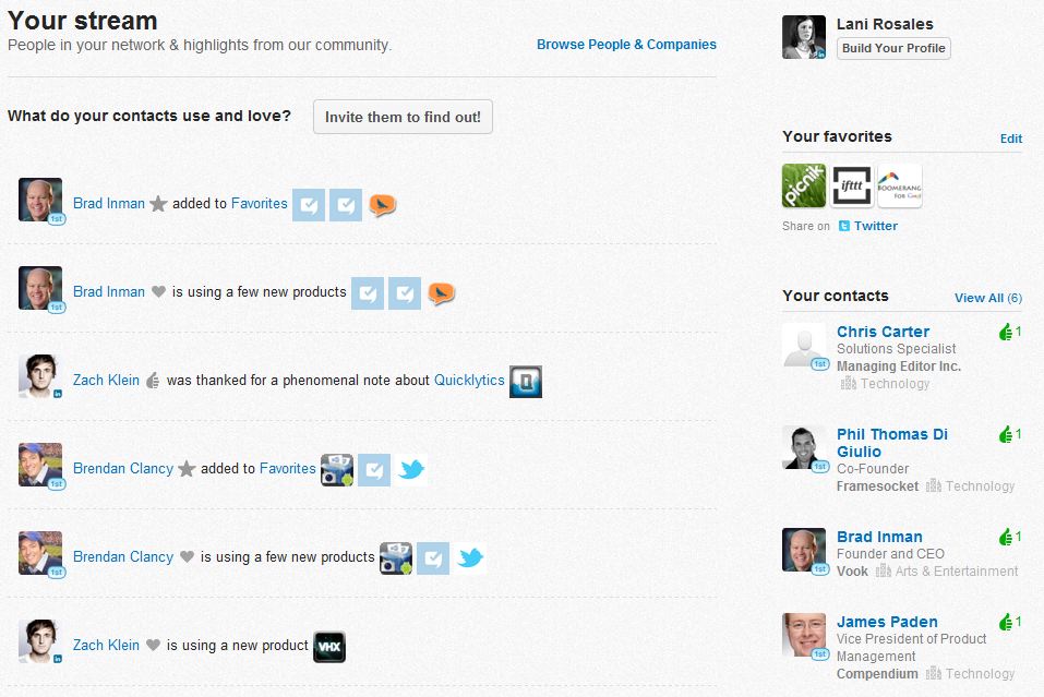 Right now it is primarily mainstream apps, but as more users join the nearly 6,000 user beta group, more products are added and the ecosystem grows. You can search other people as well as companies or browse apps by profession. It’s a time saver, money saver, and lets you ask people you already know why they like particular products rather than repeatedly spamming your entire network with helpless questions.