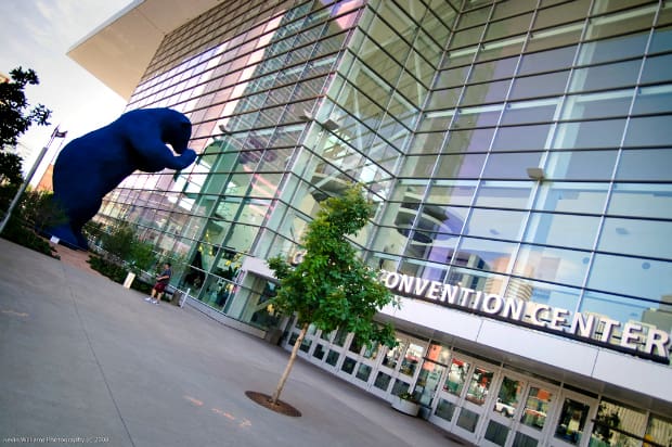 Colorado Convention Center with metal bear sculpture peering into windows. Photo by Kevin Williams.