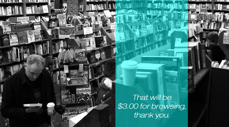 Bookstores charging for browsing? If this were to become the norm, it could hurt their business more than it could benefit. Chain booksellers could very easily set the precedent and get the ball rolling, and of course later, see the error of their ways, leaving independent stores to adapt in response.