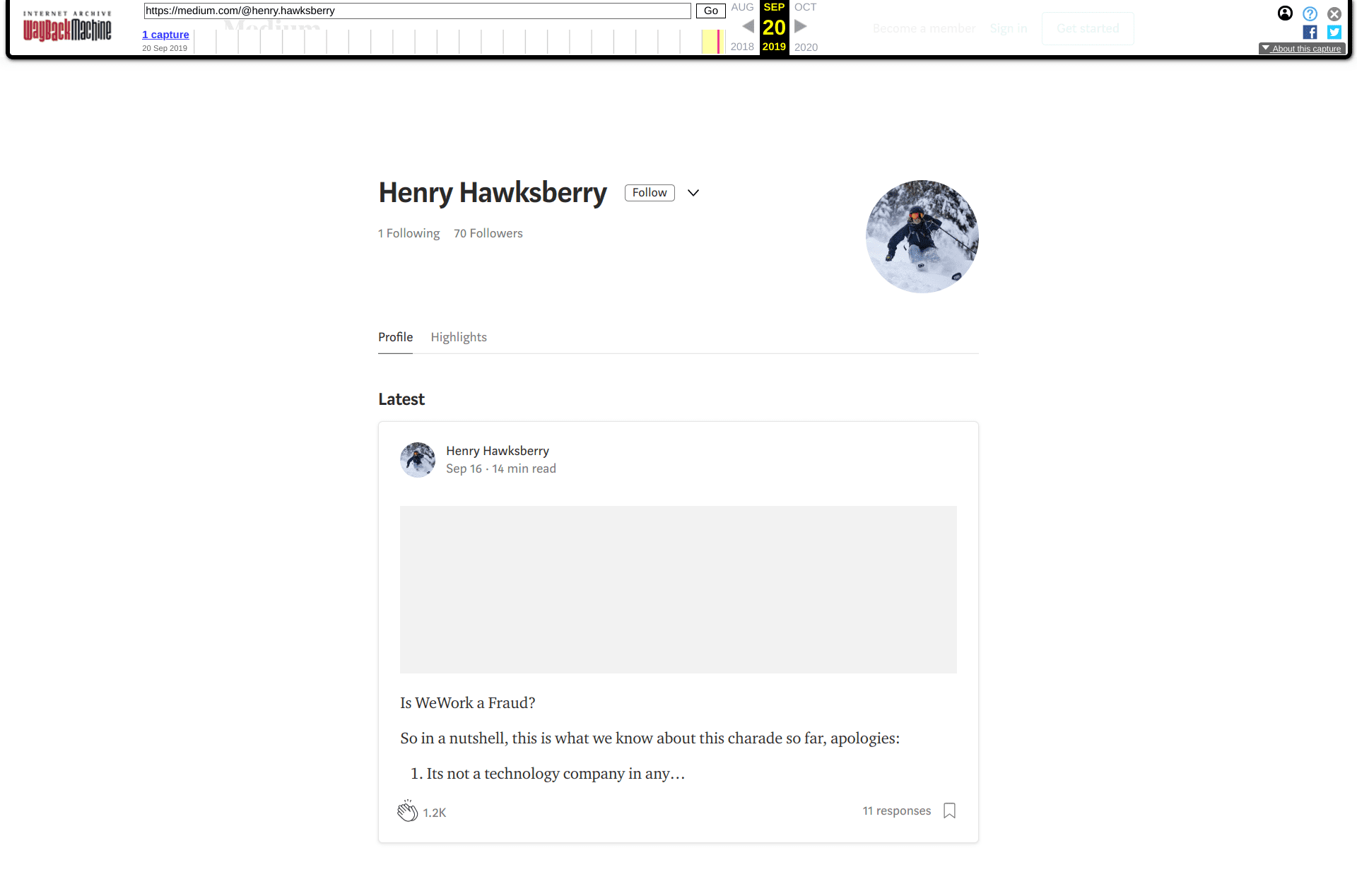 So, I went to the Wayback Machine, and there is only one instance of that account ever being captured – on September 20th, there was one blog post, a profile picture of someone skiing, they followed one person (which is not clickable, so that doesn’t yield any clues) and were followed by 70 (no surprise there since his post was already viral by the 20th).