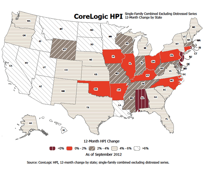 Excluding distressed sales, this month only four states posted home price depreciation Alabama (-3.1 percent), New Jersey (-1.6 percent), Delaware (-1.4 percent) and Rhode Island (-1.3 percent).