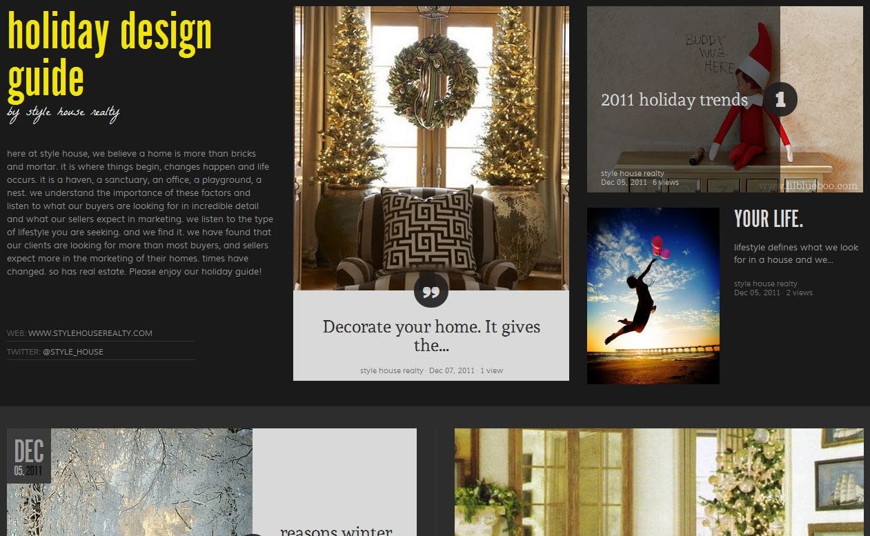 Today, we feature style house realty’s side blog on Jux called the “holiday design guide by style house realty,” and it is extremely clever! Amanda Lopez, owner of style house put together a creative site devoted not only to interior design for the holidays but of a “holiday listing” and a post promoting their Pinterest.com page. Her clever use of integrating various efforts on to one page are fascinating.