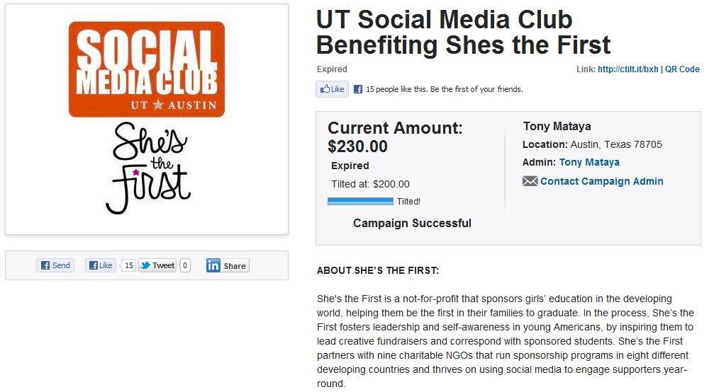 Like KickStarter, a campaign is not funded until it has “tilted,” or if the pre-determined amount has been reached. If the full funds are not raised, the money is never charged to anyone’s credit cards. Campaigns last a total of seven days before it expires, so campaigns are not infinite, rather are used for a short period of time for very specific pooling purposes.