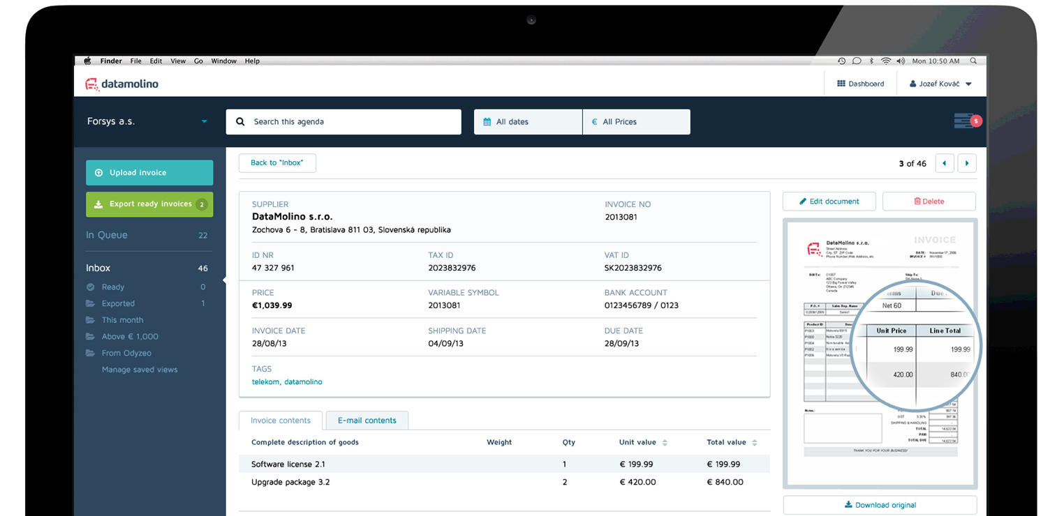 Datamolino also supports customized exports for Kros OMEGA, Stormware POHODA and Cigler MONEY S3. They are also working to integrate with QuickBooks, Sage One, Freshbooks, Xero, Freeagent, and Saasu.