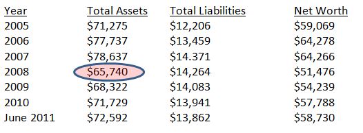 As Americans have been stuffing their piggy banks (or more likely holding back on superfluous spending), net worth has increased. Dr. Dotzour said, “Household net worth at the end of June 2011 has increased by $7 trillion from the trough in 2008. Since the trough, our stocks are up $3 trillion, our mutual funds are up almost $2 trillion, our pension fund reserves are up about $3 trillion and our savings accounts are up $.5 trillion. Our real estate assets have declined another $1.4 trillion since 2008.”