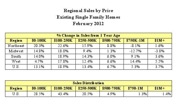 In the South, sales rose 0.6 percent for the month and 9.3 percent over the year, ending February with a median price of $138,100.
