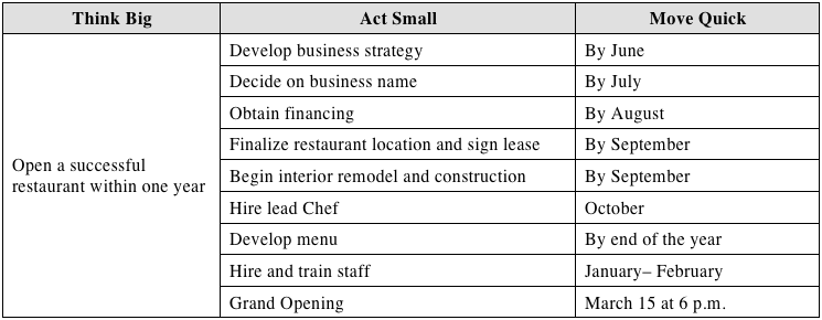 According to a recent study, the idea of this goal-setting framework is broken down into three steps: 1. Think Big, 2. Act Small, 3. Move Quickly. While some of these words may sound contradicting, they fit like a puzzle when put to the test. In order to cross that finish line, let’s break these ideas down one by one.