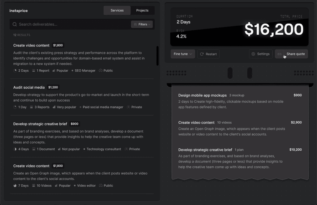 Instaprice is an all-in-one pricing tool for those pursuing freelance. Ben Issen, the creator of the application stated “too often, pricing work is an unstructured guessing art,” and I have to wholeheartedly agree with him on that. You keep playing with numbers until you find what works for you.