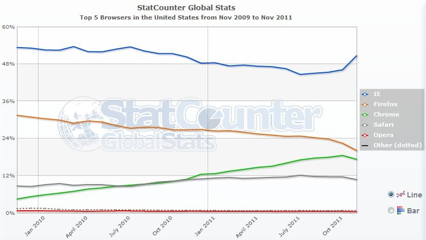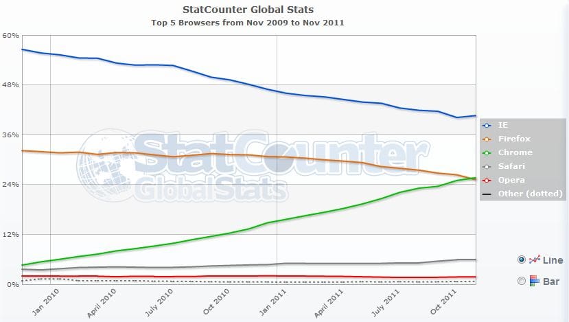 Although American browser use is slightly different, Firefox declined in use this year while Chrome use rose, noting that Chrome now accounts for 25.7 percent of the global market and 17.3 percent of the American market.