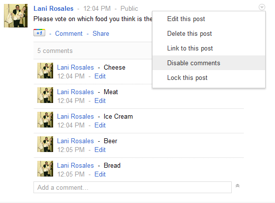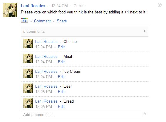 To hack your way into being a regular pollster on Google+, just postt a new status update, “Please vote on [something] by adding a +1.” Then, quickly comment with the options, “Option one” is it’s own comment, “Option two” is a separate comment to the update and so on. Then it’s time to hack it into a poll so people don’t come distort results by adding options or commenting – go to the top right of the original status update and click the little grey triangle and out of the options select “Disable comments.” Voila! You’re a pollster!