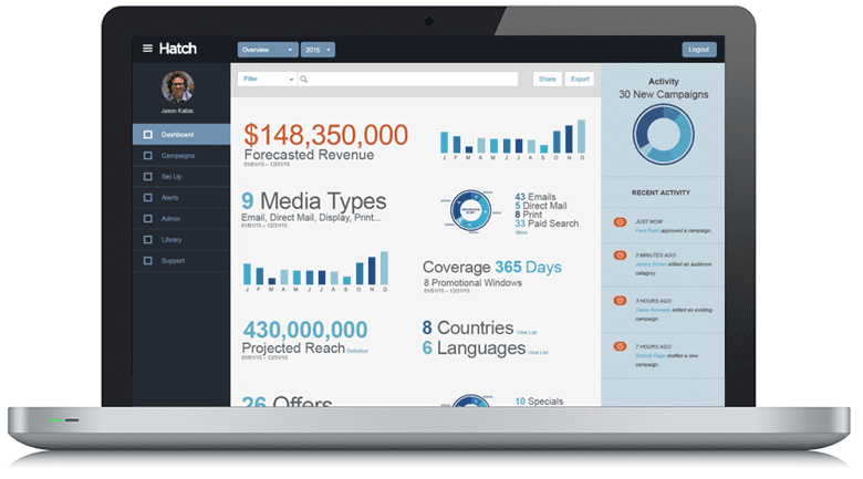 Hatch offers a combination of dashboards, calendars and playbooks. The dashboards are used to define priorities. It is a visual chart that allows the user to have instant assessment of priorities across audiences, budgets, channels, medias and offers. The calendars are built to gauge and discover opportunities. Built in futures and calendars make it easy for the user to judge campaigns, programs and plans.