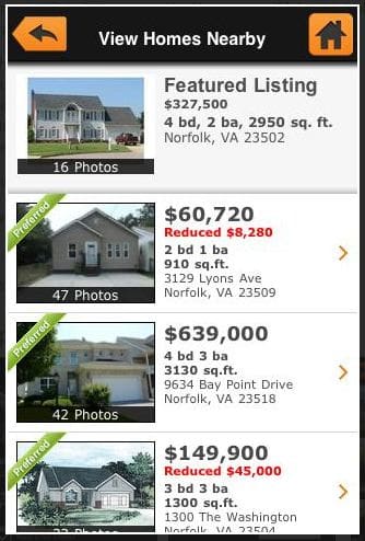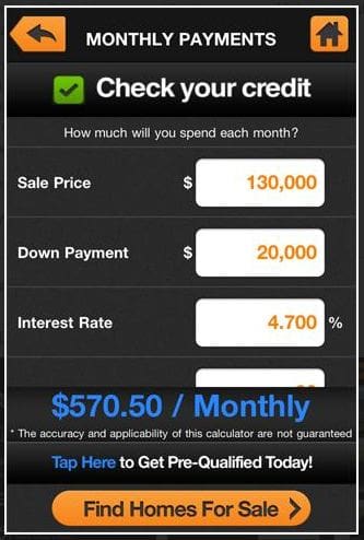 The calculators are integrated into their property search as well, so consumers can search homes and calculate simultaneously without launching separate apps. Homes.com emphasizes the ability for a mobile consumer to connect with a real estate professional via the device and screenshots reveal that consumers can pre-qualify for a loan through the Android app.
