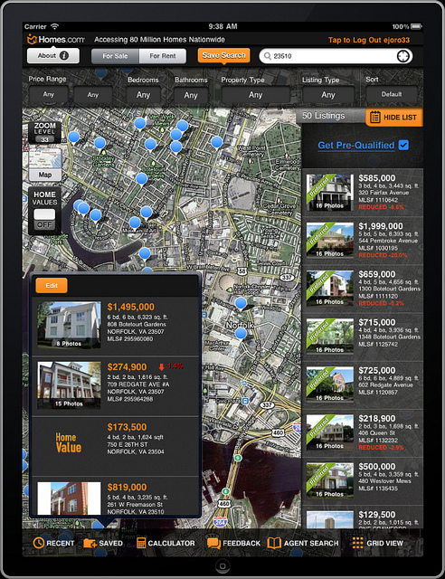 After studying consumer behavior, Homes.com tells AGBeat that they’ve taken a slightly different approach to developing their consumer-facing iPad app that serves their expressed need to better compare homes and be able to toggle between home values, homes for sale and homes for rent. With t he expansion of its mobile suite with the release of its iPad app, they say they have “specifically designed to provide home buyers and renters with an intuitive, highly targeted and easily navigable property search experience, complete with extensive listing details, powerful sort and filter tools, sweeping photos, interactive maps, driving directions, favorite property management and share features, an integrated real estate agent search and more valuable home search tools for nearly four million property listings.”