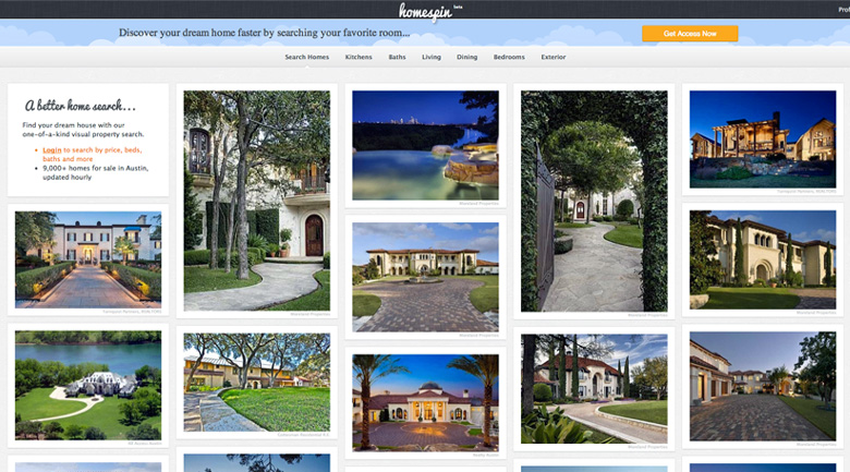 Homespin home search has launched in early beta as the visual beacon in a stat-driven industry that they say has ignored the rise of the visual web, and abandoned right brained people. Using the tile-style visual elements that coders began experimenting with years ago and made popular by Pinterest, Homespin visitors are greeted visually with images of all homes within their basic search, and while there is a sophisticated map function, the focus is on narrowing down homes by their visual appeal.