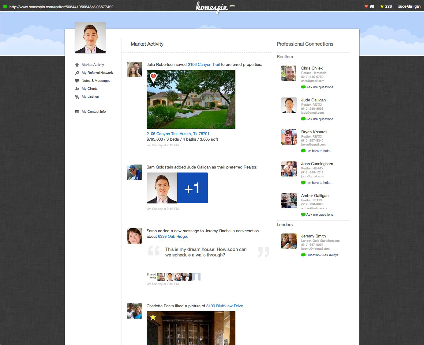- My Referral Network – as a Realtor, all of your Facebook friends and all clients who endorse (or “trust” you on Homespin) are automatically referred to you and those who endorse you are automatically referred to their friends as well, expanding your sphere of influence, always pointing back to you.