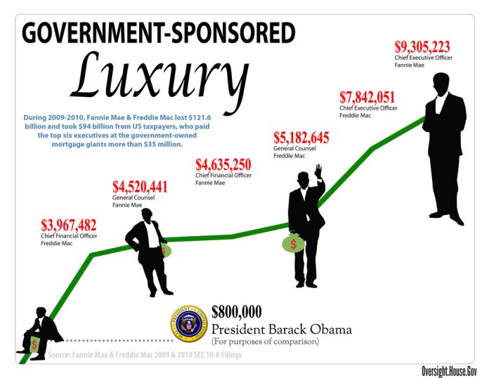 The House Committee on Oversight and Government Reform has created and released the above video in conjunction with Committee Chairman Darrell Issa’s report “Government-Sponsored Moguls: Executive Compensation at Fannie Mae and Freddie Mac” which excoriates the Administration’s rhetoric on executive compensation for the private sector as well as decisions made regarding the recent large bonuses approved for Fannie Mae and Freddie Mac executives.