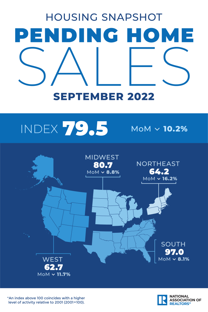 Pending home sales fell 10.2% in September, according to the National Association of Realtors (NAR), marking the fourth consecutive month of declines. Compared to September of last year, pending transactions plummeted 31.0%.
