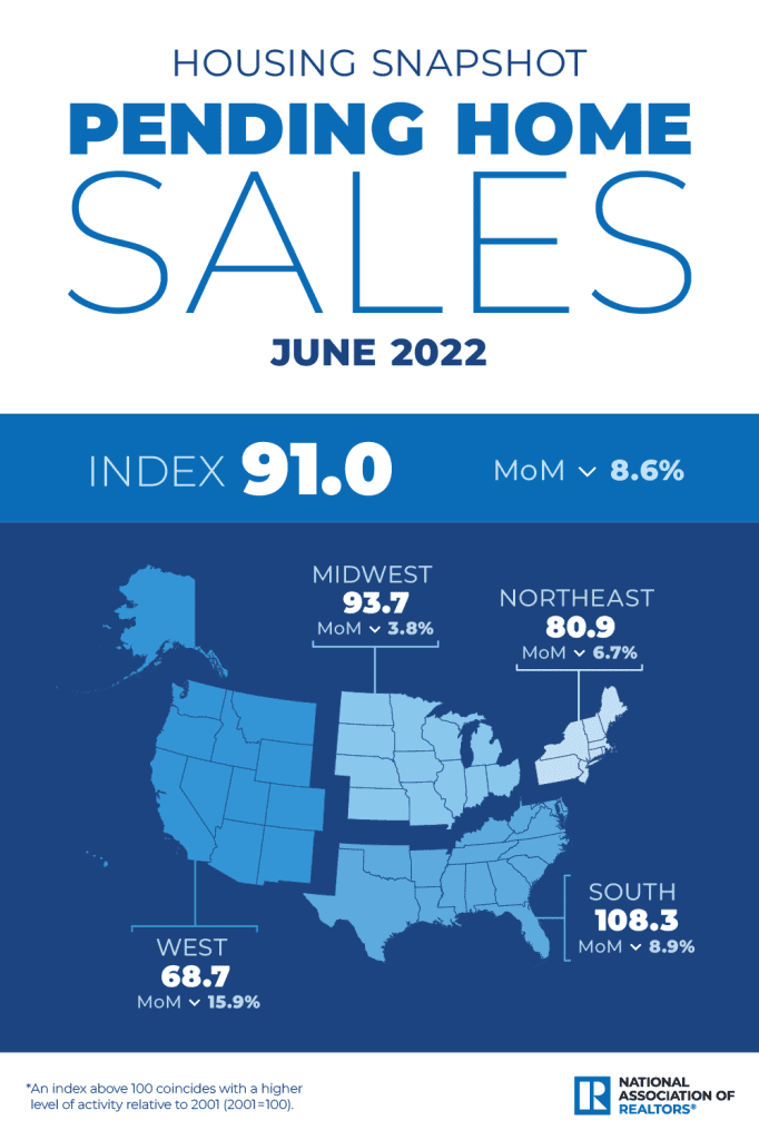 “There are indications that mortgage rates may be topping or very close to a cyclical high in July. If so, pending contracts should also begin to stabilize,” notes Dr. Yun.
