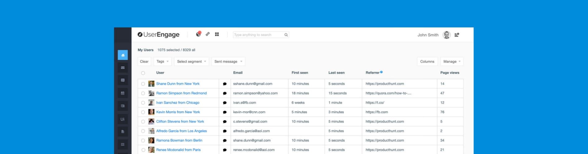 Information gathered with UserEngage an be used to trigger automatic in-app messages (chat, pop-ups, bar and other formats) or emails activating users, generating sales...
