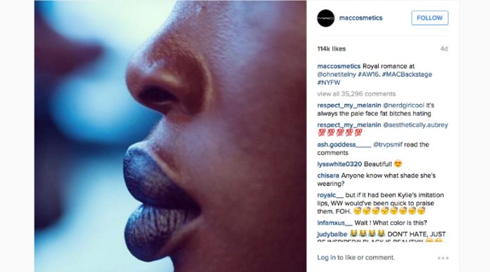 Internet trolls are still doing what they do best: troll … of course, but this time they turned their attention to cosmetic company MAC’s Instagram account. Recently, MAC cosmetics shared a backstage photo of a beautiful black woman (Aamito Stacie Lagum) wearing its “Matte Royal” lip color at the New York Fashion Week. The close-up picture focused on the model’s lips. Soon after, the image was bombarded with hateful comments about the models naturally full lips.
