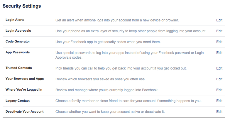 Go into your general security settings (see picture above), and select “Login Approvals.” Follow the steps to receive your code. This security option sends a code to you that must be entered when attempting to logon. You’ll be asked to use this number when logging on from any unknown browser.