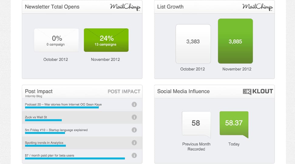 One of the pain points of social media is keeping track of metrics. How are your emailers doing? What content is popular on your blog and what’s a waste of your time? How are your outstanding invoices shaping up? What’s your Klout score today? Each of these and many more services require you to open a new tab, log in, and find out the answer, but Informly has stepped in to simplify things by pulling simple stats from your favorite cloud services, presenting them as simple charts, all for free.