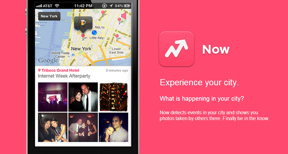 The “Now” app solves that problem by utilizing Instagram’s API to aggregate pictures uploaded into the app, analyze them to see which pictures are coming in from the same place and time, group them and enlist super users to tag those pictures and create event titles. If pictures from users at the same event begin to flow in with similar tags, the user pool can create an official event title and it shows up on the map with the exact location.
