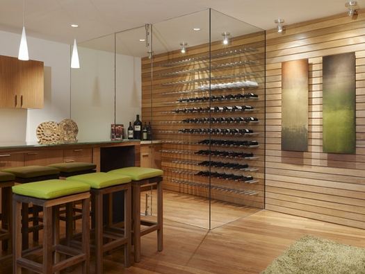 Nor do wine cellars have to be in a cellar. Home builders are including wine cellars in various new homes across America and homeowners are adding wine storage in unlikely places- closets, halls, office areas, basements, and the like. Below are modern versions of wine cellars ranging from simple custom racks to architectural feats devoted to wine and entertaining.