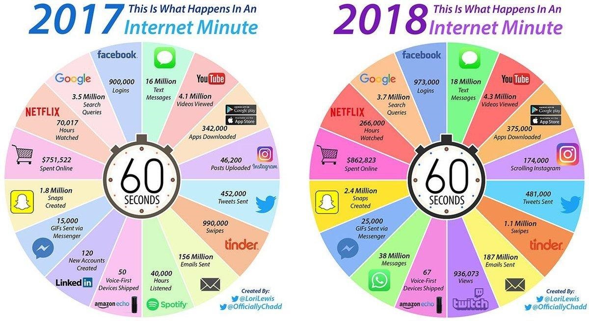 The infographic also listed that in 2017, there were 40,000 hours of Spotify listened to per minute, and in 2018, there were 38 million What’s App messages sent per minute.