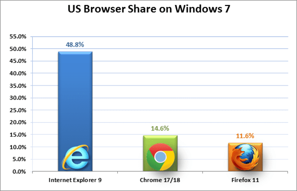 According to NetApplications, Internet Explorer is gaining ground in the heated browser wars. Microsoft points out that they now account for nearly half of Windows 7 users’ browsing use, measuring their core metric of Internet Explorer 9 (IE9) use.