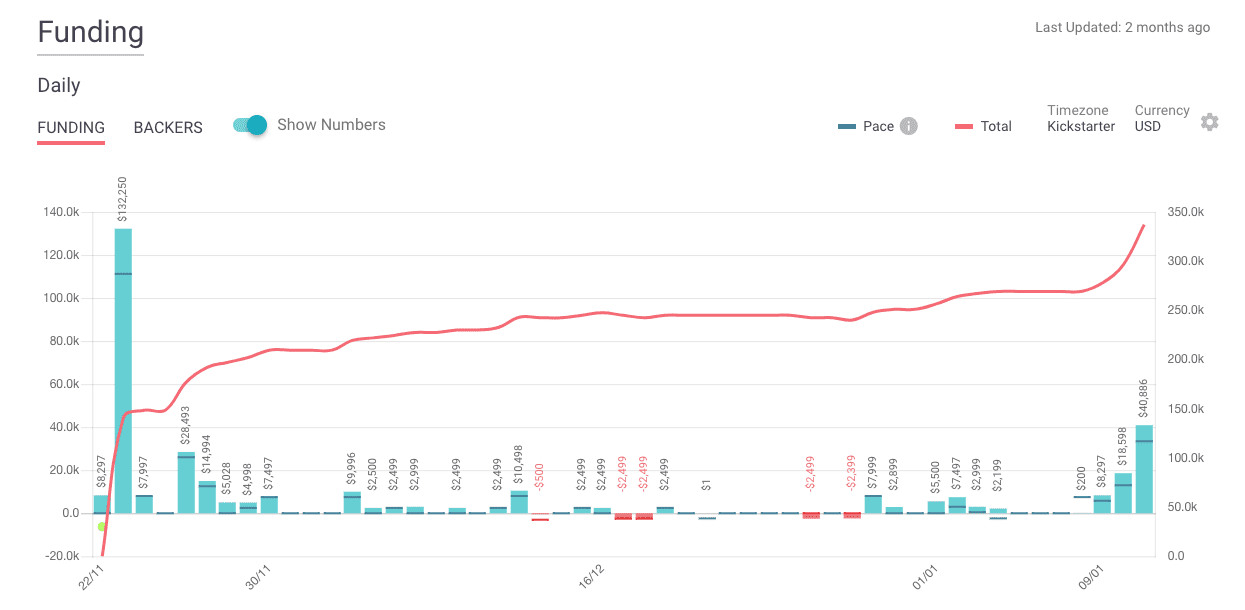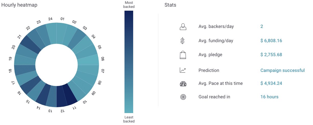You can see the data behind the backers and pledges from a daily and hourly standpoint, as well as a favorite feature of mine: the ability to view average funding per day and average funding pace, since you don’t want to end your campaign too early.