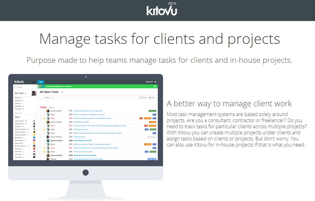 You can see what work need to be done for a client or project, without sifting through endless email threads. Kitovu is a cloud-based, centralized, transparent, collaborative tool, allowing teams to communicate on the tasks that need to get done, quickly and efficiently.