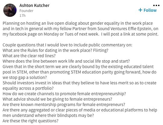 If I told you that Ashton Kutcher was hosting a live dialog about the state of gender equality in the tech sector, some of you might (understandably) balk at the notion.