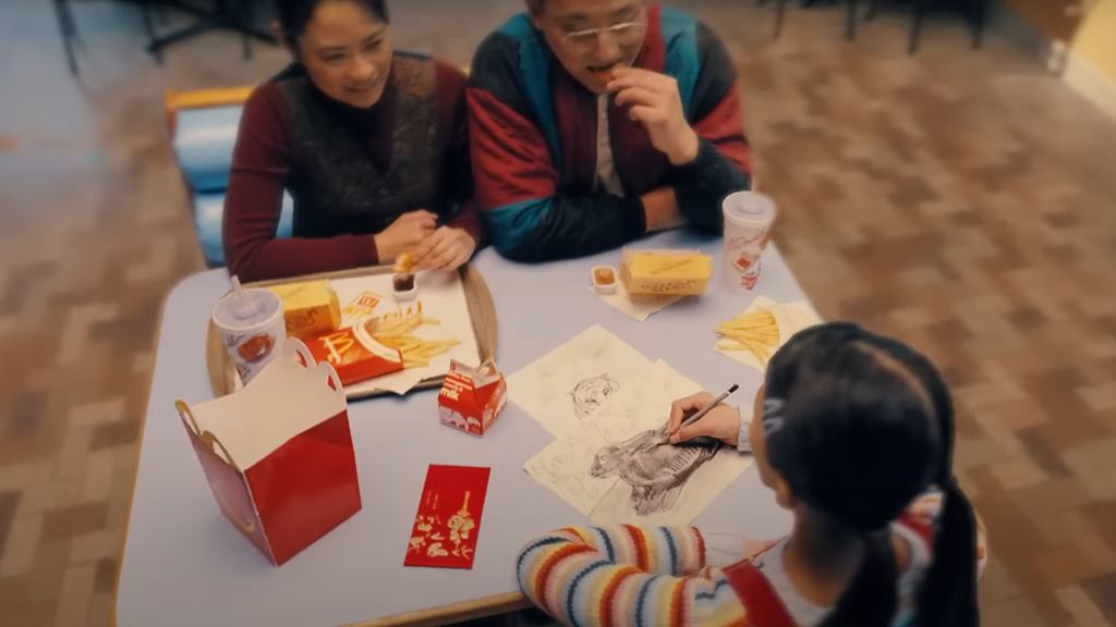 The ad in question explores a freeze-frame of a family eating at a McDonald’s while Cheng narrates the scene, explaining the significance of Lunar New Year to her while the camera pans about and then goes into the food bag on the table, emerging on the “other side” of the bag in a brand-new scene that features Cheng in the flesh.