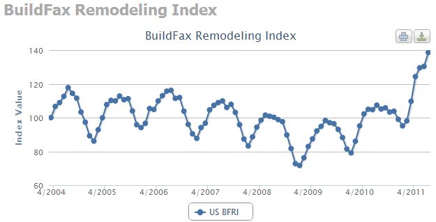 According to National Mortgage Professional, BuildFax’s Index “is the only source directly reporting residential remodeling activity across the nation with monthly information derived through related building permit activity filed with local building departments across the country. This monthly report provides month-over-month and year-over-year comparisons on trends in remodeling activity for the entire United States, as well as for the four major regions of the country: Northeast, south, midwest and west.”